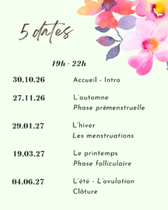 Ateliers Ton Cycle et TOI Quand octobre 30, 2026 7:00 pm - 10:00 pm Ajouter au Calendrier Télécharger ICS Calendrier Google iCalendar Office 365 Outlook Live Réservations $0,00 Réservez maintenant Type d’évènement Atelier Cycle Atelier, cycle, nutrition, yoga On est tellement contentes de te proposer cette série d’ateliers avec Corentine et Aline. En t’inscrivant, tu es directement inscrite aux 5 dates. 400.- pour les 5 soirées avec collations et un livret. Partiellement remboursé par ASCA et RME selon le couverture d’assurance Réservations Billets Places 1 2 3 4 5 6 7 Information d’inscription Nom Téléphone E-mail Commentaire Je consens à ce que mes données soumises soient recueillies et stockées comme décrit par le site . Booking Summary 1 x Réserver $0,00 Prix total $0,00